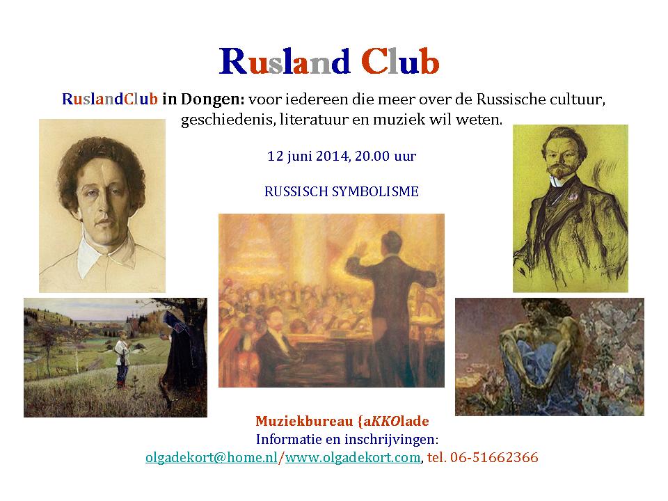 ►Russisch symbolisme (literatuur, muziek, theater, schilderkunst, met o.a. K.Balmont, A.Blok, M.Vroebel, M.Nesterov, N.Roerich, Mir iskusstva, A.Skrjabin). ►12 juni 2014, 20.00-22.00 uur, Dongen. ►door Olga de Kort-Koulikova. ►Locatie: muziekbureau {aKKOlade (Lage Ham 13-03). ►€ 12,50. ►Meer informatie en inschrijving:www.olgadekort.com, olgadekort@home.nl of tel. 06-51662366.