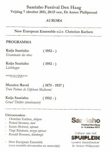 7 oktober 2011, Dr. Anton Philipszaal, Den Haag. Saariaho Festival, New European Ensemble olv Christian Karlsen. K.Saariaho. Grammaire des rêves, Lichtbogen, M.Ravel. Trois Poèmes de Stéphane Mallarmé, K.Saariaho. Graal Théâtre (vioolconcert). Voor het concert: Presentatie composities van het educatieproject. Van alle natuurverschijnselen is het noorderlicht waarschijnlijk het laatste dat je in Den Haag kunt tegenkomen. Toch zit ik […]